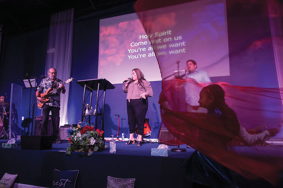 When Mr. Cabrera takes the Sunday stage, the music turns up and the audience sways to the beat beneath American flags and a “Make America Godly Again” sign.