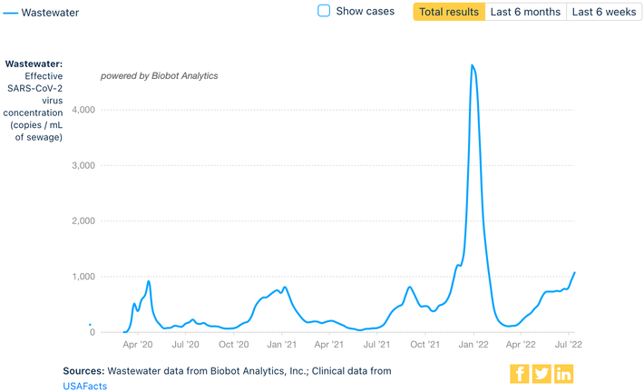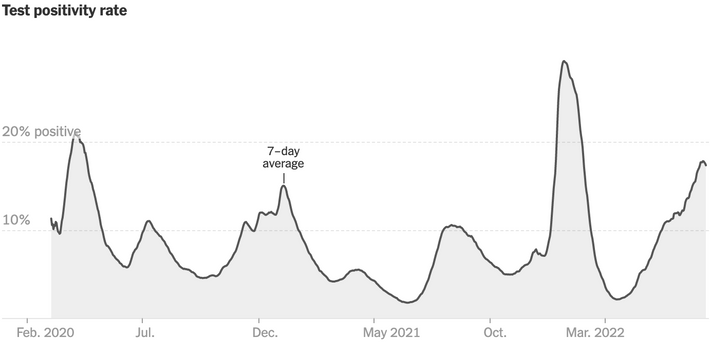 According to the CDC’s COVID community level ratings, which factor in reported cases and hospital capacity, 55 percent of Americans now live in high risk communities where they should be masking up again — up 32 percent from the previous week. (All of New York City, along with most of the downstate region, are currently rated high risk by that metric as well.) Now that unreported at-home rapid testing is the new normal, official case counts are an antiquated metric, and so it’s impossible to know how many cases there actually are nationwide. There may be as many as 300,000 to 500,000 Americans getting newly infected or reinfected every day, Dr. Anthony Fauci said last week. The wave is clearly visible in COVID wastewater data too: